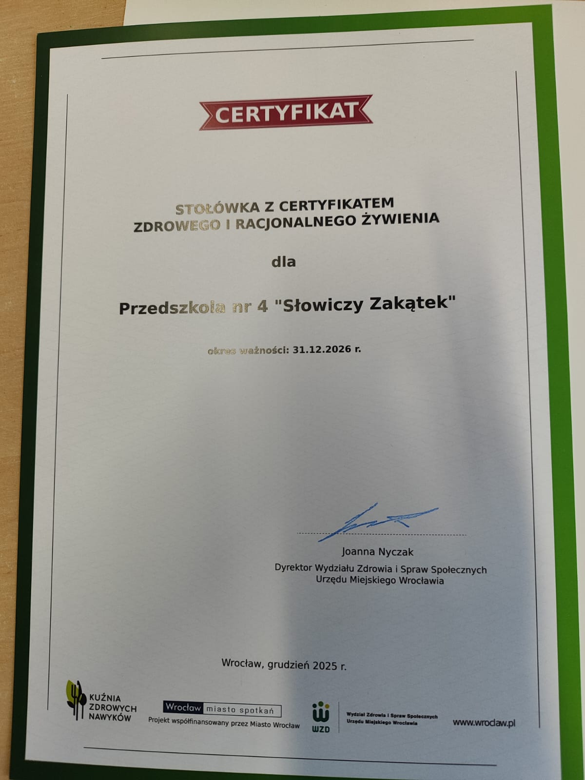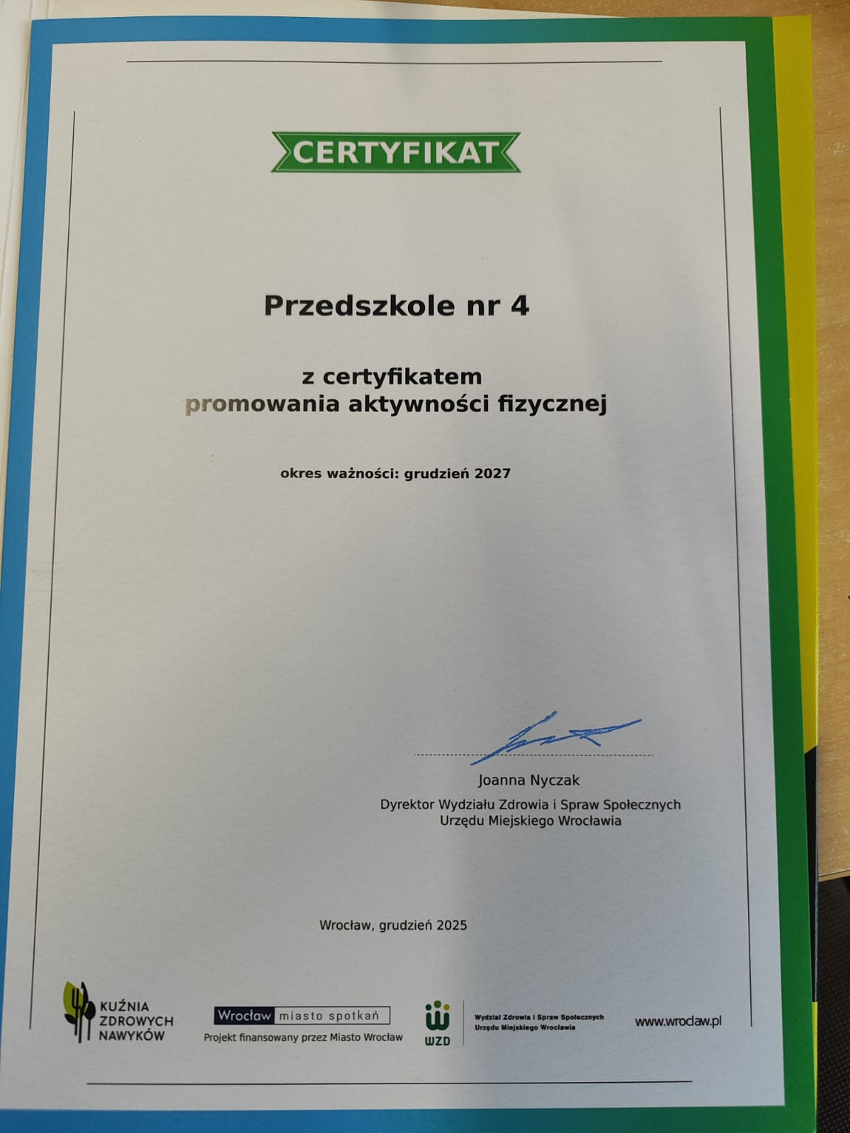 Z radością informujemy, że nasze przedszkole zdobyło dwa certyfikaty: ZDROWEGO I RACJONALNEGO ŻYWIENIA oraz PROMOWANIA AKTYWNOŚCI FIZYCZNEJ.